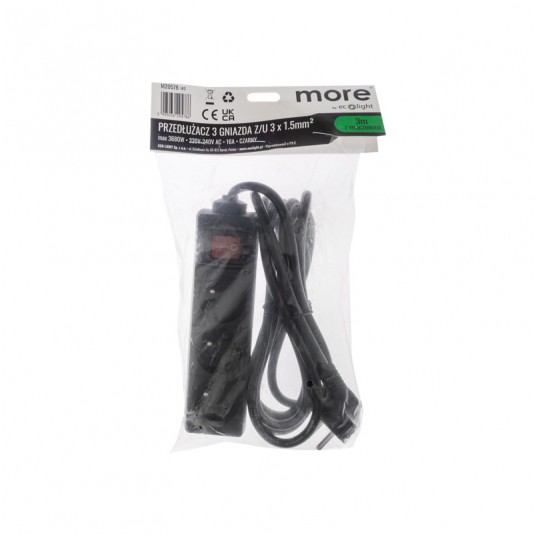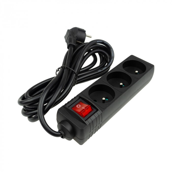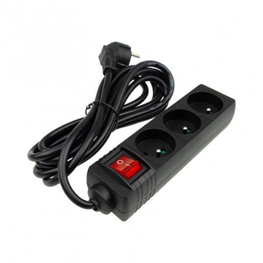 Przedłużacz elektryczny z trzema gniazdami i przewodem o długości 3 metrów, w kolorze czarnym. Wyposażony jest w wyłącznik z podświetleniem, który pozwala na wygodne sterowanie zasilaniem oraz zwiększa bezpieczeństwo użytkowania.