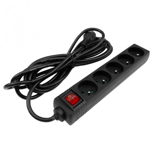 Przedłużacz 5-gniazdowy 5m czarny IP20 z wyłącznikiem, moc maksymalna 3680W