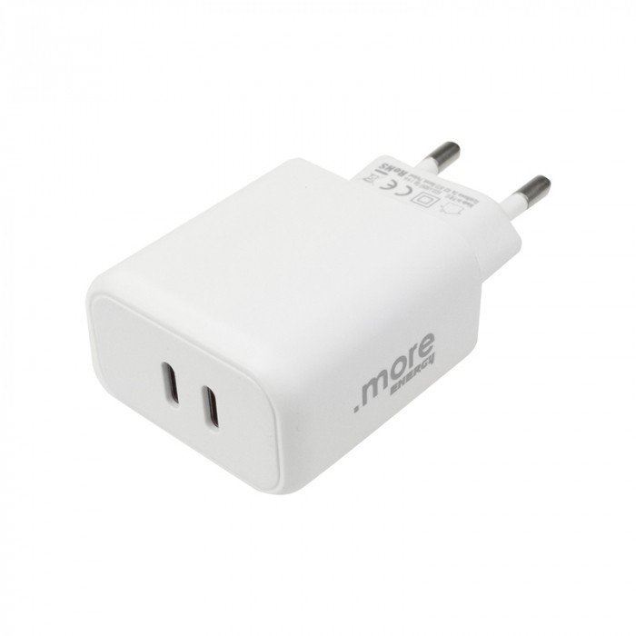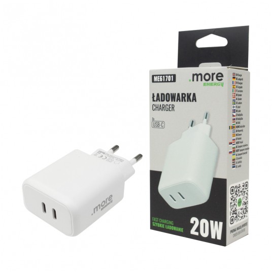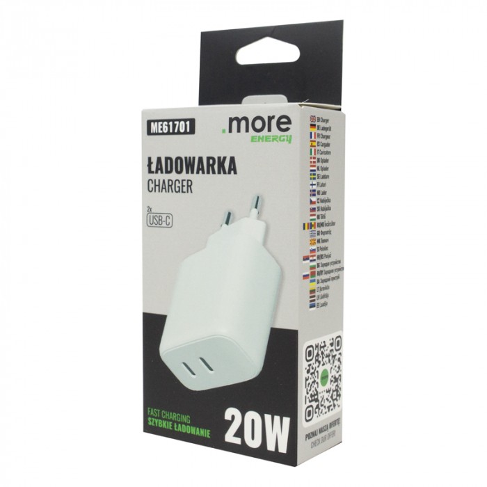 Model oferuje moc 20W, zapewniając sprawne i stabilne ładowanie. Napięcie wejściowe 220–240V 50/60Hz pozwala na wygodne użytkowanie w standardowych instalacjach elektrycznych. Stopień ochrony IP20 wskazuje na przeznaczenie do użytku wewnętrznego, w suchych pomieszczeniach. Szeroki zakres parametrów wyjściowych zwiększa kompatybilność z różnymi urządzeniami, a dwa złącza USB-C podnoszą funkcjonalność produktu.