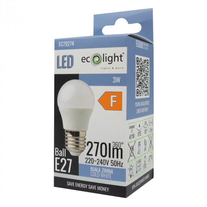 Dzięki neutralnemu kształtowi kulki i standardowemu gwintowi E27, żarówka pasuje do większości popularnych opraw. Emituje jasne, chłodno-białe światło o temperaturze barwowej 6500K i strumieniu świetlnym 270 lumenów, co zapewnia dobre doświetlenie przestrzeni przy niskim zużyciu energii – tylko 3W. Kąt świecenia 180° pozwala równomiernie rozprowadzać światło, idealnie sprawdzając się w kinkietach, lampkach biurkowych czy oświetleniu dekoracyjnym.