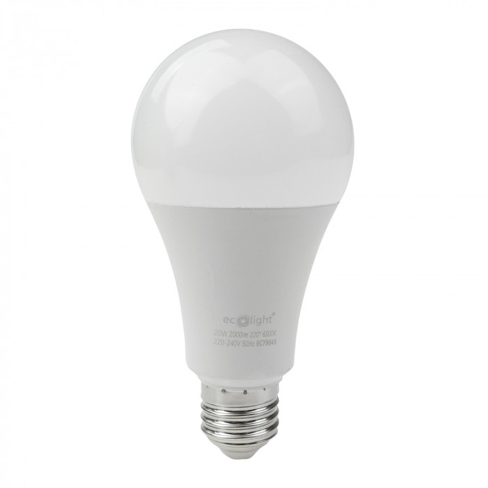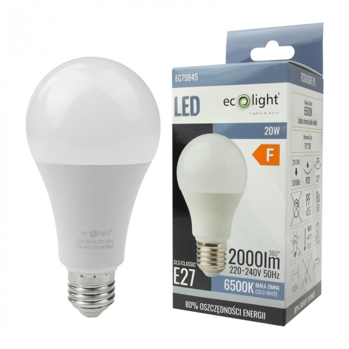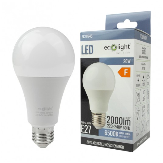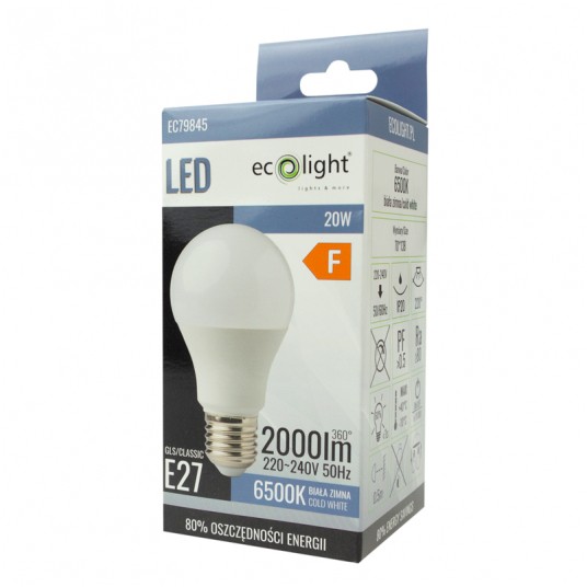 Żarówka LED Eco-Light A60 Classic z gwintem E27 to wydajne źródło światła o mocy 20W, które emituje zimną, białą barwę o temperaturze 6500K. Produkt zapewnia jasny strumień świetlny o wartości 1800 lumenów, rozpraszany pod kątem 180 stopni, co gwarantuje szerokie i równomierne oświetlenie pomieszczenia.