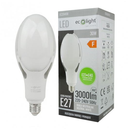 Nowoczesna żarówka LED o mocy 30W wyposażona w adapter E27 do E40 to energooszczędne źródło światła, które z powodzeniem zastępuje tradycyjne żarówki o mocy 100W. Dzięki neutralnej barwie światła 4000K oraz wysokiemu strumieniowi świetlnemu 3000 lumenów, idealnie sprawdza się zarówno w zastosowaniach zewnętrznych, jak i wewnętrznych.