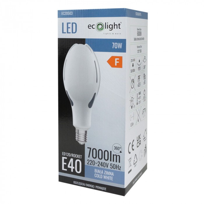Poznaj żarówkę Rocket E40 o mocy 70W, która zapewni Ci jasne i efektywne oświetlenie na najwyższym poziomie. Dzięki strumieniowi świetlnemu 7000 lumenów i barwie światła 6000K, lampa emituje chłodne, naturalne światło idealne do dużych przestrzeni przemysłowych, magazynów czy hal produkcyjnych.