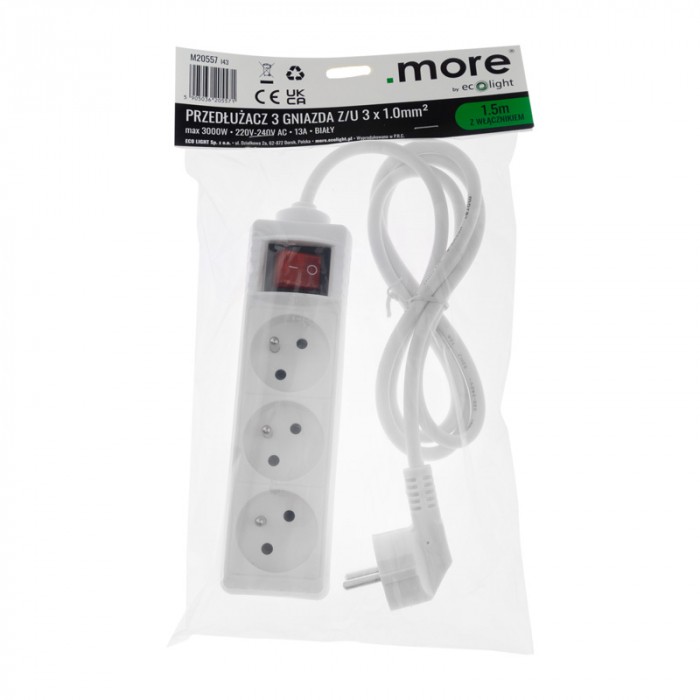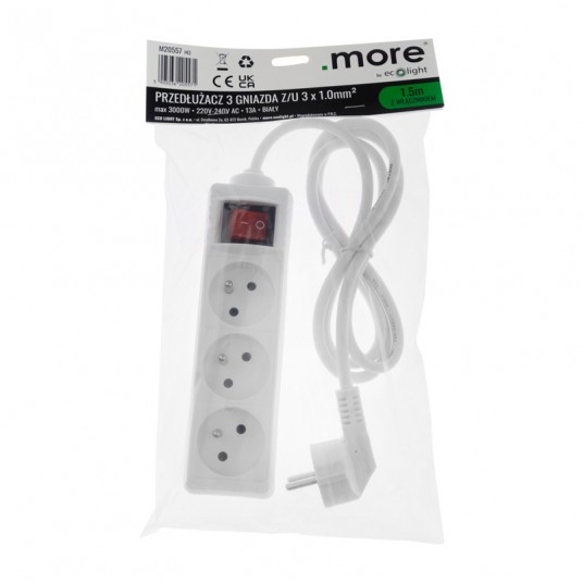 Przedłużacz sieciowy o długości 1,5 metra w kolorze białym to funkcjonalne rozwiązanie, które pozwala na jednoczesne zasilanie trzech urządzeń elektrycznych. Dzięki kompaktowej konstrukcji oraz solidnemu, elastycznemu przewodowi, sprawdzi się zarówno w domu, jak i w biurze czy przestrzeni publicznej.