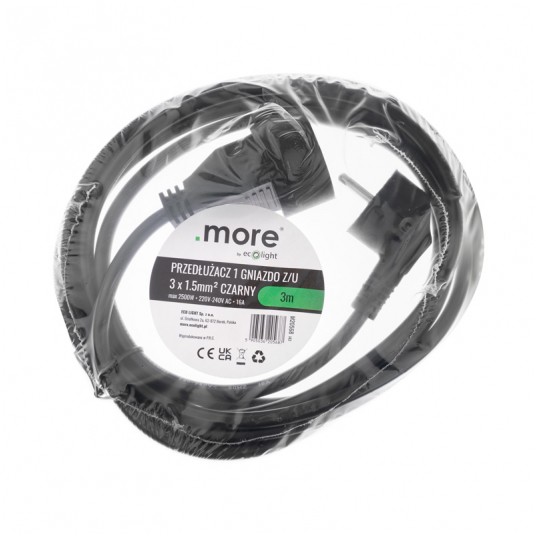 Przedłużacz Jednogniazdowy z Uziemieniem 3 m, 3x1,5 mm², Czarny