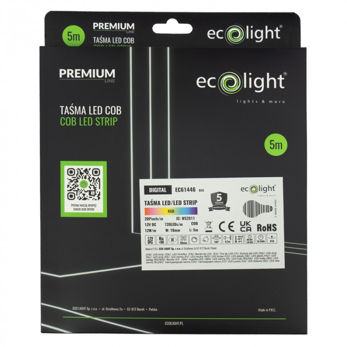 Taśma LED RGB o wysokiej gęstości 720 diod COB na metr, zapewniająca wyjątkowo intensywne, jednolite i płynne oświetlenie bez widocznych punktów świetlnych. Dzięki sterownikowi WS2811 możliwe jest precyzyjne, cyfrowe sterowanie segmentami taśmy, co pozwala na tworzenie efektownych animacji, przejść kolorów i dynamicznych scen świetlnych.