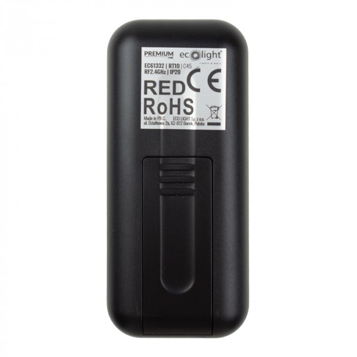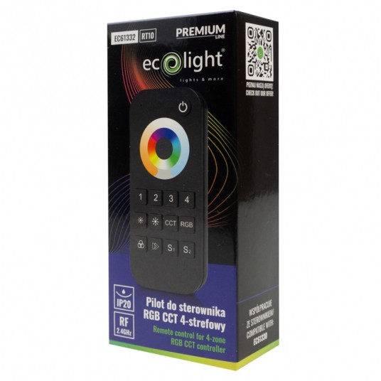 RT10 to elegancki pilot RF do taśm RGB+CCT (R/G/B/WW/CW) pozwalający sterować aż 4 niezależnymi strefami. Intuicyjny panel dotykowy (wybór koloru/temperatury bieli) oraz przyciski funkcyjne (ON/OFF, jasność itp.) zapewniają szybkie i wygodne sterowanie. Łączność RF (fale radiowe) działa bez „celowania” – sygnał przechodzi przez meble i lekkie ścianki.