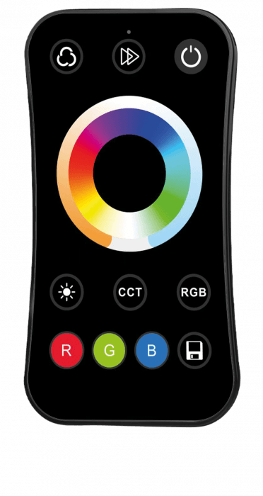 Kompaktowy, czarny pilot dotykowy RF do sterowania taśmami RGB+CCT (R/G/B/WW/CW) poprzez kompatybilne kontrolery. Jedna strefa, szybkie ON/OFF, płynna regulacja koloru, nasycenia, jasności oraz temperatury bieli. Łączność RF (fale radiowe) działa bez „celowania” – wygodnie sterujesz nawet przez meble i ścianki g-k. Smukła obudowa 107 × 58 × 8 mm dobrze leży w dłoni i pasuje do nowoczesnych wnętrz.