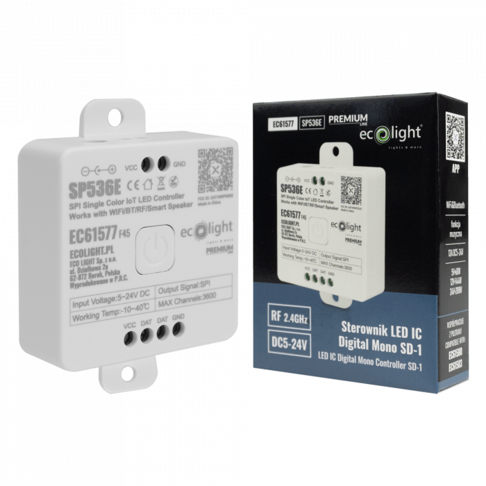 Jednokanałowy sterownik LED MONO z łącznością Wi-Fi, Bluetooth i RF. Umożliwia płynne ściemnianie taśm LED 5–24 V DC, lokalnie (BT), z aplikacji przez sieć Wi-Fi oraz pilotem radiowym RF. Maksymalne obciążenie 12 A pozwala zasilać długie odcinki taśmy – do 288 W przy 24 V.