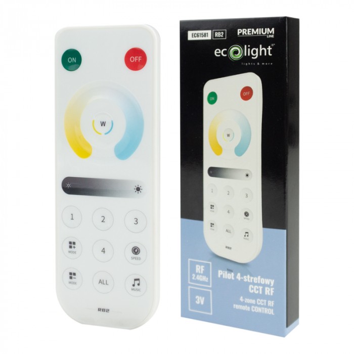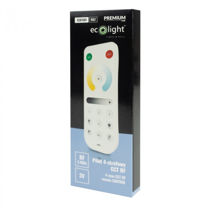 Wygodne sterowanie oświetleniem CCT w 4 niezależnych strefach. Pilot RF współpracujący ze sterownikiem IC SD-2 zapewnia płynne ściemnianie 0–100% oraz regulację barwy bieli od ciepłej do chłodnej. Stabilna komunikacja radiowa, proste parowanie i solidne wykonanie PREMIUM LINE.