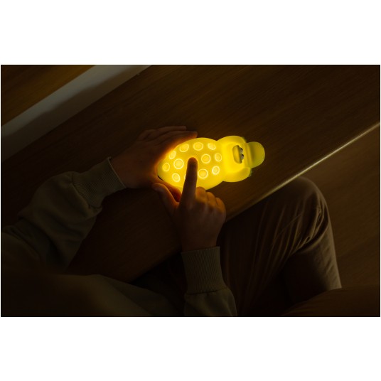 Wbudowany akumulator zapewnia naprawdę długą pracę bez kabla. W trybach nocnych potrafi świecić nawet przez wiele dni, a pełne ładowanie przez złącze USB-C nie wymaga specjalnych ładowarek. Korpus łączy miękki w dotyku silikon z solidną obudową, dzięki czemu lampka jest przyjemna, trwała i gotowa na codzienne użytkowanie w pokoju dziecka.