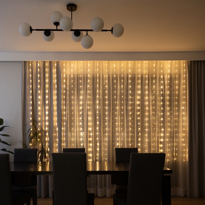 Zamień ścianę lub okno w przytulną, nastrojową scenę. Kurtyna 3 × 2 m z 400 diodami LED w ciepłej barwie 3000K działa na bezpieczne USB 5 V, pobiera tylko 4 W i świetnie sprawdza się w domu, na eventach, w witrynach oraz jako tło do foto/wideo.
