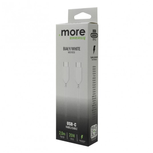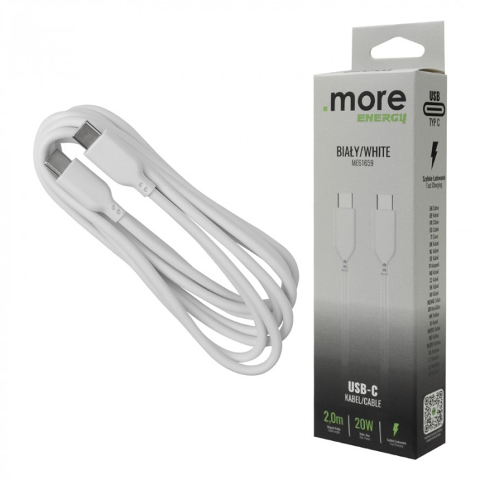 Przewód obsługuje ładowanie i oferuje moc do 20 W, co pozwala na wygodne zasilanie kompatybilnych urządzeń, takich jak smartfony, słuchawki czy inne akcesoria wyposażone w port USB-C. Biały kolor przewodu nadaje mu estetyczny, uniwersalny wygląd.