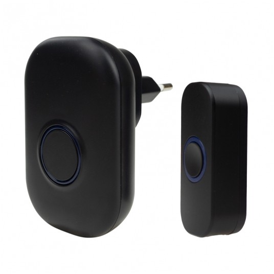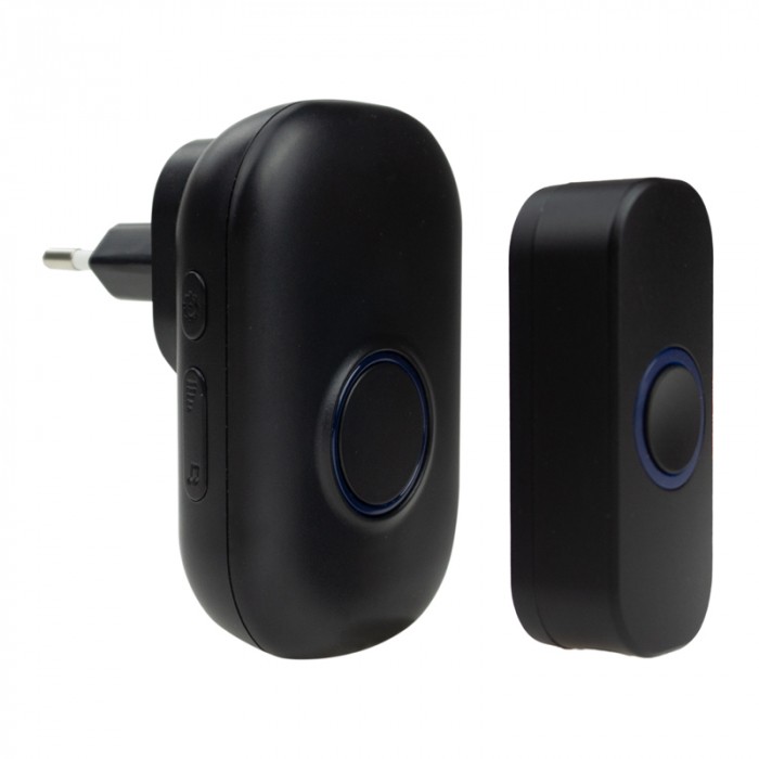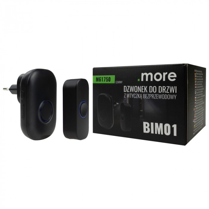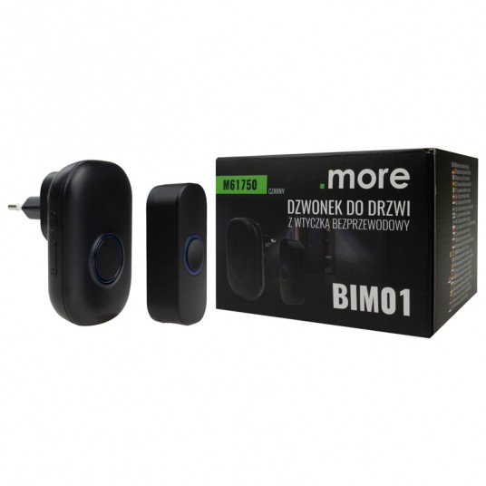 Dzwonek do drzwi z wtyczką bezprzewodowy BIM-01, czarny to wygodne i praktyczne rozwiązanie do domu, mieszkania, biura lub lokalu usługowego. Zestaw składa się z bezprzewodowego nadajnika oraz odbiornika wkładanego bezpośrednio do gniazdka, dzięki czemu montaż jest szybki i nie wymaga prowadzenia przewodów.