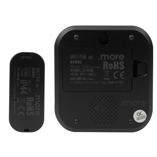 Dzwonek do drzwi na baterie bezprzewodowy BAM-02, czarny to praktyczne i wygodne rozwiązanie do domu, mieszkania, biura lub lokalu usługowego. Zestaw składa się z bezprzewodowego nadajnika oraz odbiornika zasilanego bateryjnie, dzięki czemu nie wymaga podłączenia do gniazdka i zapewnia większą swobodę montażu.