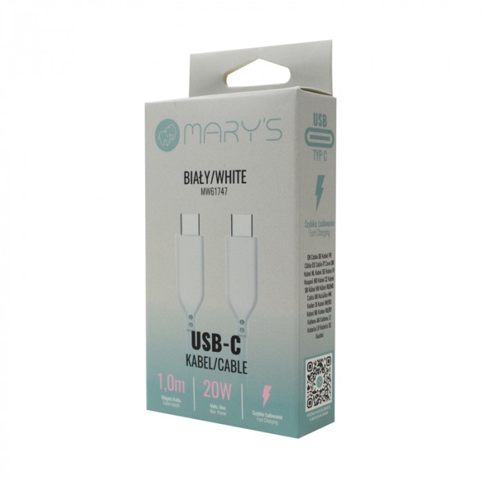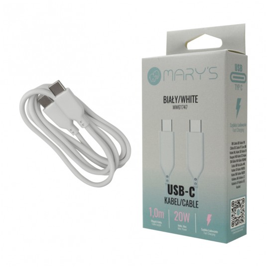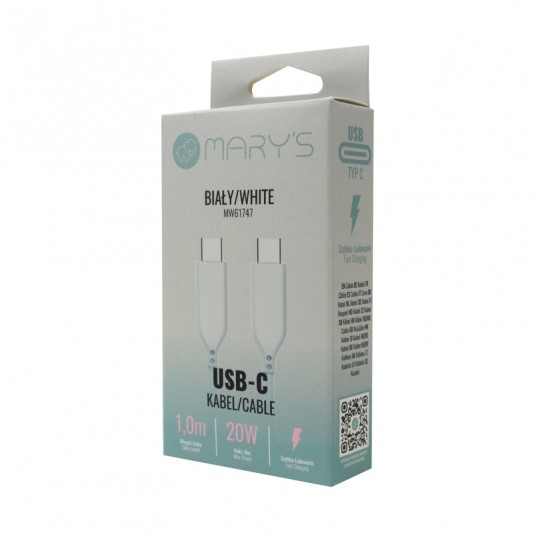 MARY'S Kabel USB-C biały 1 m to praktyczny przewód do codziennego użytkowania, przeznaczony do ładowania oraz transmisji danych w urządzeniach kompatybilnych ze złączem USB-C. Dzięki długości 1 metra sprawdzi się w domu, biurze, samochodzie oraz podczas podróży, zapewniając wygodne podłączenie urządzeń.