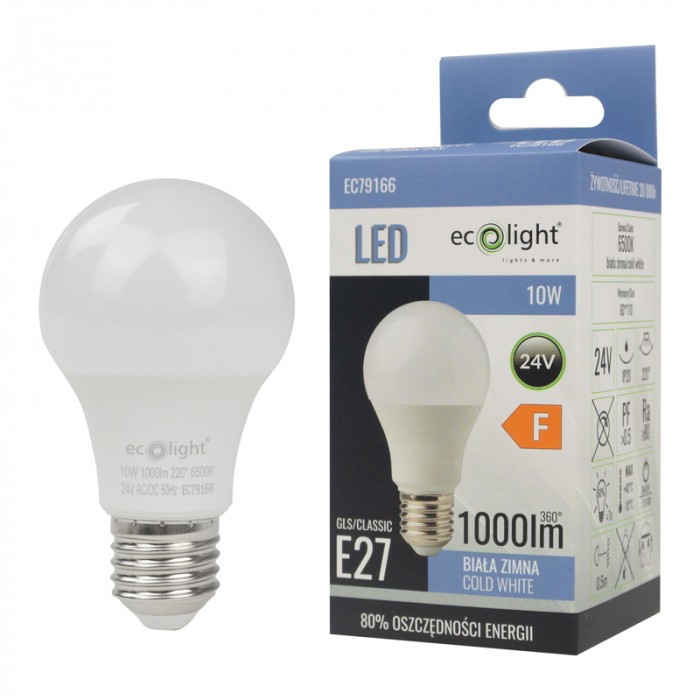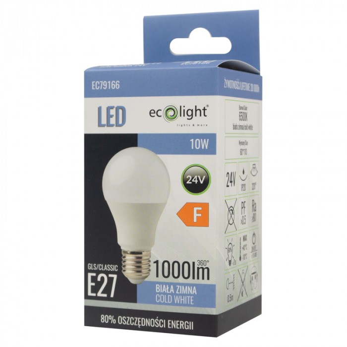 Żarówka LED marki Eco-light, model EC79166, o mocy 10W, przeznaczona do standardowego gwintu E27. Emituje zimne, białe światło o temperaturze barwowej 6500K i jasności 900 lumenów, zapewniając równomierne oświetlenie pod kątem 180 stopni. Produkt działa przy napięciu 24V, charakteryzuje się trwałością do 20 000 godzin oraz wskaźnikiem oddawania barw (CRI) na poziomie około 80. Współczynnik mocy (PF) wynosi powyżej 0,5. Żarówka ma średnicę 60 mm oraz wysokość 108 mm. Pakowana jest po 100 sztuk.